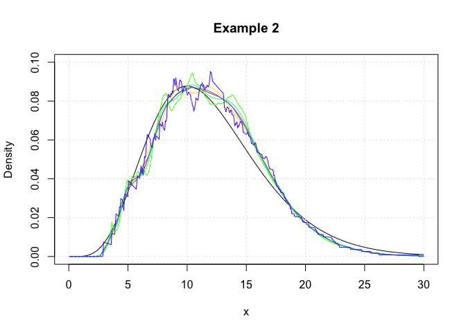 plot(c(0,30),c(0,0.1),type='n',xlab='x',ylab='Density',main='Example 2')